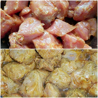 Depois do lombo ficar 1 hora na marinada, separe os lombos da marinada. Coloque um fio de azeite na frigideira e frite os cubos de lombo em fogo médio a alto até ficarem bem cozidos.